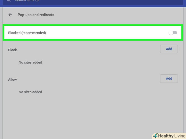 Пересуньте повзунок в положення "включити".ця опція повинна бути включена за замовчуванням, але, можливо, ви або інший користувач відключили її. Так ви активуєте блокувальник спливаючих вікон.