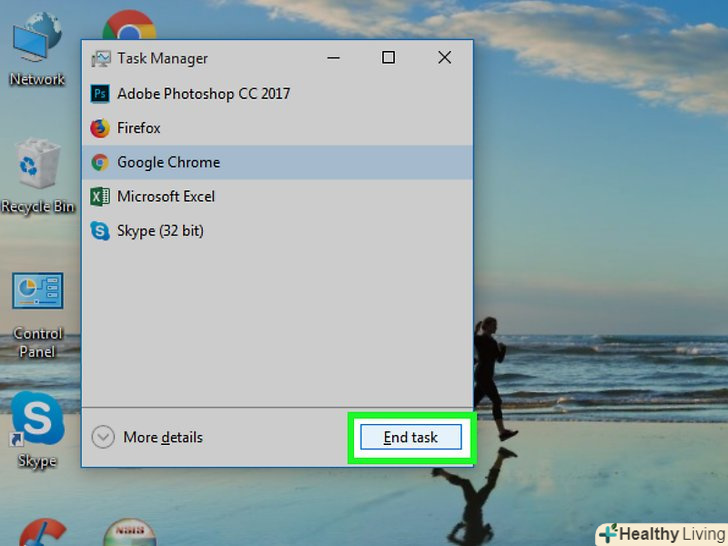 Примусово закрийте веб-браузер.якщо вкладку закрити не вдалося, закрийте вікно веб-браузера. В цьому випадку буде втрачено все, над чим ви працюєте в інших вкладках, тому закривайте вікно браузера тільки в крайньому випадку.- Windows: натиснітьCtrl+⇧ Shift+Esc, виберіть веб-браузер і натисніть «Завершити завдання».