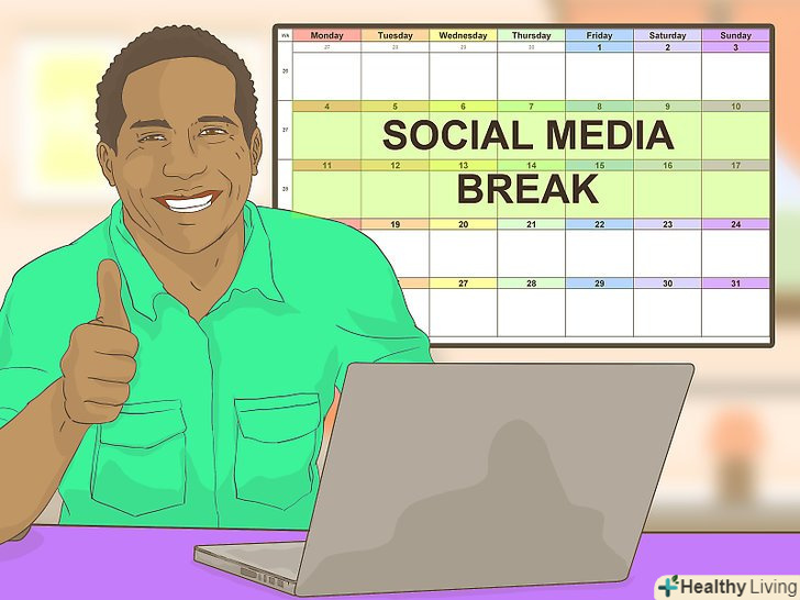 Виберіть момент для перерви.найкраще відпочивати від соціальних мереж під час сімейних свят або відпочинку. Це дозволить вам проводити весь вільний час за бесідами з рідними і не відволікатися на оновлення.[2]- Також можна зробити перерву, якщо вам необхідно приділяти всю свою увагу людині або справах (наприклад, під час роботи над дипломом).