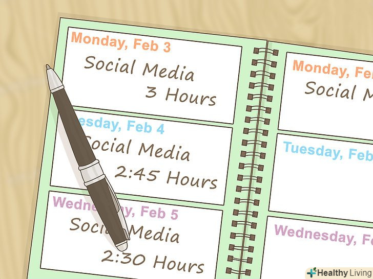 Придумайте графік, щоб поступово скоротити час, який ви витрачаєте на соціальні мережі.наприклад, якщо ви хочете зробити перерву з Нового року до Різдва, то почніть рідше бувати в соціальних мережах незадовго до Нового року. Приступайте до справи за 10 днів до моменту початку перерви. Тимчасові обмеження будуть залежати від того, скільки часу ви проводите в соціальних мережах в звичайний день.[4]- Наприклад, якщо ви приділяєте соціальним мережам дві години на день, скоротіть цей період до півтори години за 10 днів до початку перерви. За тиждень до паузи скоротіть час до однієї години в день. За чотири дні до перерви скоротіть час до 30 хвилин в день.