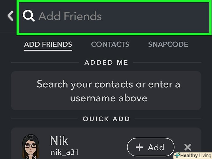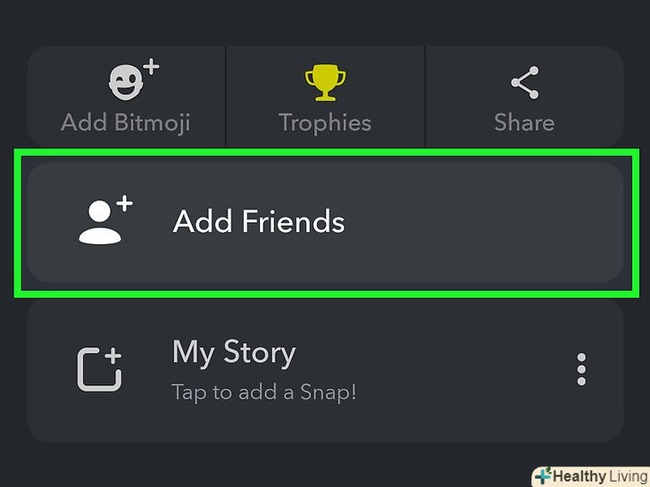 Торкніться опціїДодати друзів в центрі сторінки.- Якщо ви фізично перебуваєте поруч з одним і у нього теж відкрито додаток, нехай він просканує ваш снапкод у верхній частині сторінки профілю.