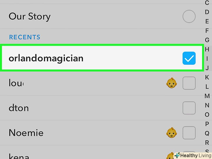 Торкніться імені кожного друга, якому хочете відправити снап.праворуч від Імен відобразяться сині галочки.