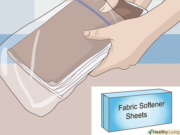Використовуйте листи для пом'якшення тканини.ці листи видаляють неприємний запах з тканини. Проте ви також можете використовувати даний засіб, щоб видалити запах цвілі з книг. Будьте обережні, оскільки листи для пом'якшення тканини можуть пошкодити сторінки книги. Поріжте листи на три частини і помістіть по листу в книгу з інтервалом в 20 сторінок. Помістіть книгу в пакет із застібкою-блискавкою на кілька днів. Неприємний запах повинен зникнути.[5] спробуйте наступне:- Цей метод також можна використовувати, щоб попередити появу неприємного запаху цвілі. Просто помістіть аркуш для пом'якшення тканини в кожну п'яту книгу, що стоїть на вашій книжковій полиці.
