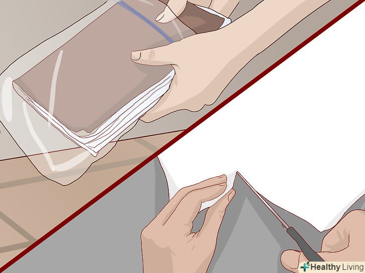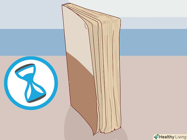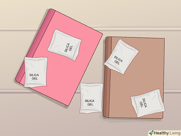 Використовуйте пакетики з силікагелем для видалення вологи.ви можете придбати пакетики з силікагелем в магазині матеріалів для образотворчого мистецтва і рукоділля; силікагель — є потужним абсорбентом, він вбирає зайву вологу, не залишаючи їй шансів зіпсувати книгу.[2] помістіть пакетики на сторінки книги і залиште їх на три дні. Якщо ви переживаєте про те, що на сторінках книги залишаться відбитки, залиште пакетики з силікагелем на один день.[3]