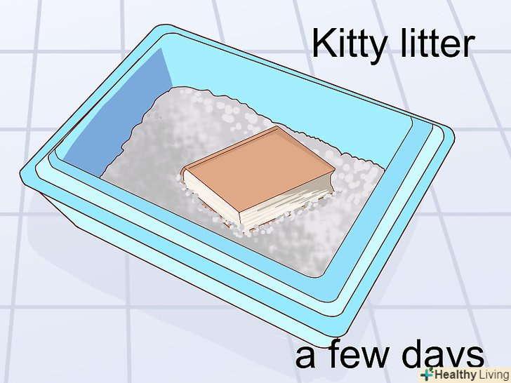 Використовуйте наповнювач для котячого туалету.вам знадобиться два контейнери: великий і маленький. Заповніть велику ємність наполовину наповнювачем для котячого туалету. Він є хорошим абсорбентом. Помістіть книгу на дно контейнера меншого розміру. Поставте маленький контейнер з книгою в більший контейнер, заповнений наповнювачем для котячого туалету.[4]- Залиште книгу в контейнері з наповнювачем протягом декількох днів. Перевіряйте стан книги раз в кілька днів. Коли запах зникне повністю, дістаньте книгу і видаліть пил (використовуйте новий пензлик). Якщо запах все ще залишається, повторіть процес, поки він не зникне повністю.