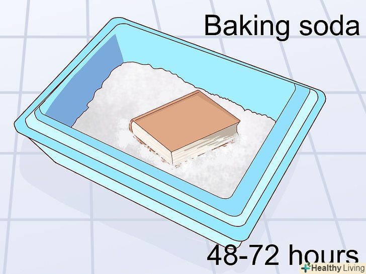 Використовуйте харчову соду.помістіть склянку харчової соди в пластикову коробку або подібну ємність. Помістіть книгу або книги (можна використовувати кілька книг одночасно) в обрану ємність і закрийте щільно кришкою. Залиште книгу в ємності протягом 48-72 годин, а потім перевірте її стан. Повторюйте процес до тих пір, поки запах не зникне повністю.- Можна використовувати інший метод, якщо ви живете в сухій і сонячній місцевості: посипте кожну десяту сторінку содою. Залиште книгу відкритою на свіжому повітрі протягом декількох днів, часто перевертаючи сторінки. Продовжуйте робити це до тих пір, поки не позбудетеся від неприємного запаху. Однак, на жаль, цей метод не завжди приносить очікуваний результат. Крім того, не слід використовувати цей метод, якщо ви хочете видалити запах з цінних або антикварних книг.