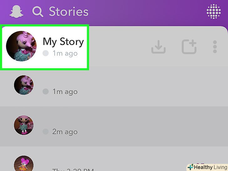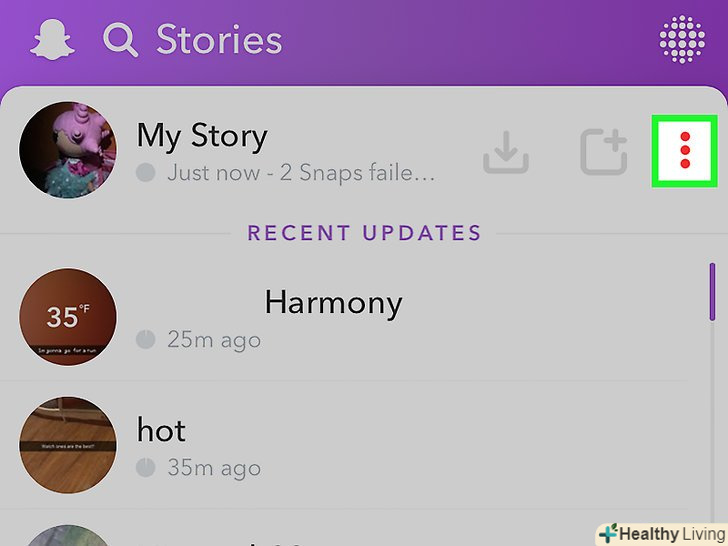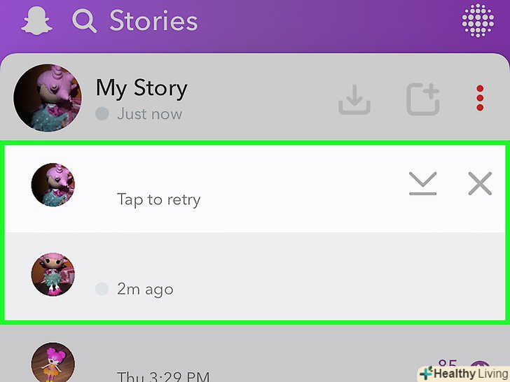 Натисніть на меню поруч з написом My Story / Моя історія.тут можна побачити список всіх знімків, які не вдалося завантажити під час авіарежиму. Над кожним знімком повинні з'явитися слова Tap to retry / торкніться, щоб повторити спробу. Найстаріший знімок (який ви зробили першим) буде розташований в самому низу списку.- Кнопка меню виглядає як іконка шестерінки на iPhone або iPad і як ⁝ на Android.
