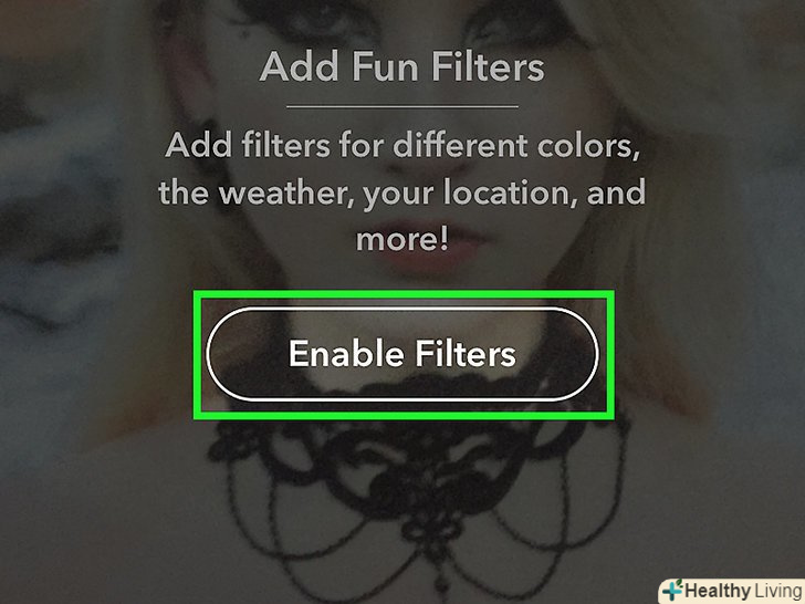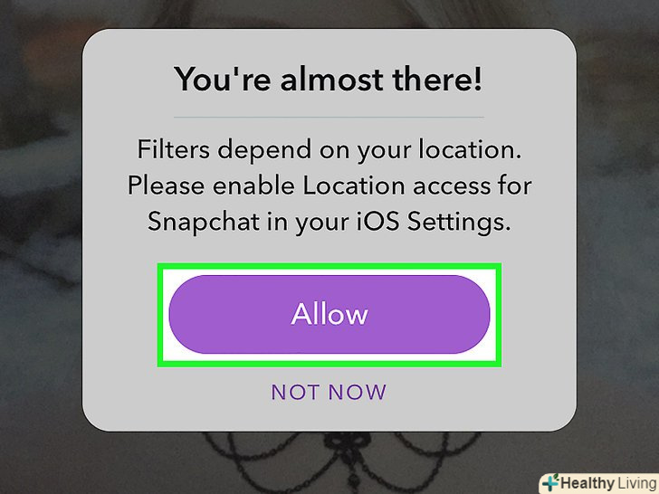 НатиснітьОК , щоб дозволити Snapchat використовувати ваші геодані і включити фільтри в налаштуваннях програми.- Коли ви включите фільтри (а з ними і доступ до геоданих), вони залишаться включеними до тих пір, поки ви не вимкнете їх в Налаштуваннях.