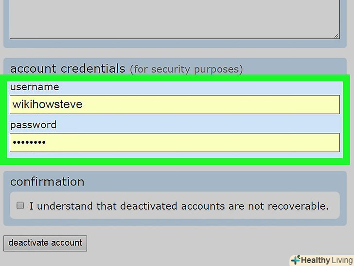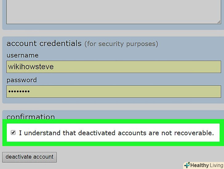 Підтвердіть видалення облікового запису. відзначте прапорцем поле поруч з текстом: «I understand that deactivated accounts are not recoverable» (Я розумію, що відключені акаунти не підлягають відновленню), тим самим підтверджуючи, що ви дійсно хочете видалити свій аккаунт.