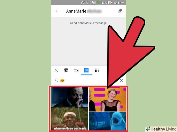 Введіть ключове слово для пошуку гіфок (або натисніть на емодзі). якщо ви хочете відправити гіфку, щоб показати своє збудження, введіть в поле «радісно схвильований» або натисніть на усміхнений емодзі. Після цього з'явиться нова галерея з гифками, які будуть відповідати вказаному критерію.- Наприклад, якщо ви натиснете на емодзі жаби (або введете в пошук «жаба»), пошуковий запит буде включати в себе гифки з жабами. Після цього з'явиться кілька рухомих зображень з жабами. Перегорнути список з гифками можна так само, як галерею з фотографіями.
