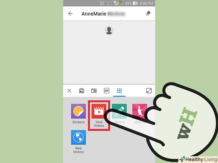 Виберіть розділ «вірусні відео», щоб відправити популярне відео з інтернету. коли ви потрапите на сторінку вірусних відео, введіть в рядок пошуку ключове слово, щоб знайти конкретне відео, або перегорніть список, щоб виявити щось нове.- Коли знайдете відео для відправки, натисніть на нього, щоб додати це відео в чат.