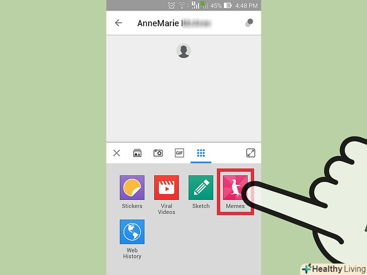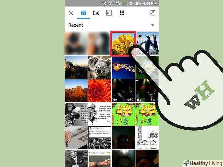 Натисніть на квадрат з шести точок і виберіть "меми", якщо хочете вставити текст в смішне зображення. тут можна вибрати фото з галереї (меню пошуку немає) і вставити в нього свій текст.- Перегорніть галерею, щоб знайти потрібне зображення, а потім натисніть на нього, щоб відобразити зображення в повному розмірі.