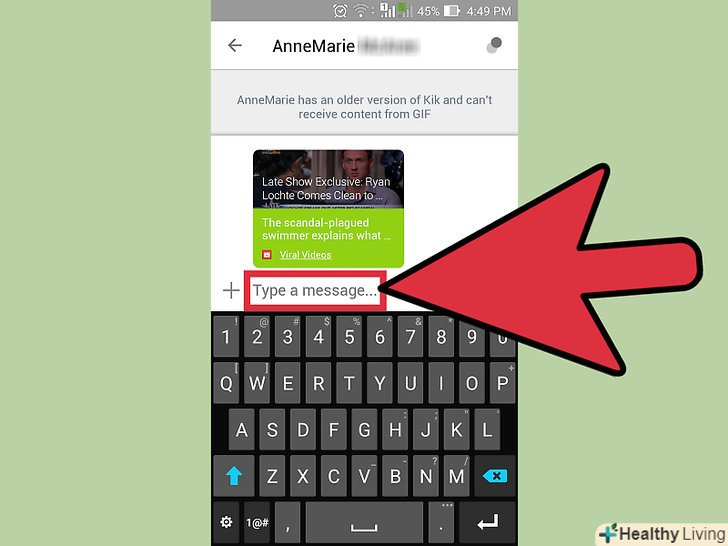 Запустіть програму " Kik " і виберіть потрібну розмову в списку чатів. [1] Коли ви запустите додаток, то опинитеся в головному меню, де побачите список чатів.- Завдяки вбудованій галереї, в повідомлення можна прикріплювати анімовані гіфки , вірусні відео з YouTube і меми . Прикріплювати інші типи файлів на даний момент не можна.