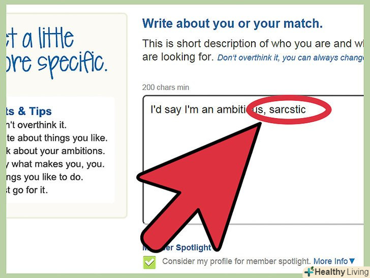 Ретельно подумайте над тим, як справити максимально позитивне враження. те, що люди побачать про вас в Інтернеті, зумовить їх сприйняття вас – а другого враження в онлайн світі не існує. Якщо ви вибираєте фото свого обличчя для сайту знайомств, виберіть найприємнішу фотографію, зроблену за допомогою якісної фотокамери. Якщо ви пишете короткий опис про себе на форумі, опишіть свої самі незвичайні і захоплюючі інтереси. Пишіть закінчені пропозиції і Перевіряйте орфографію. Пишіть коротко і по справі. Люди приділяють мінімум часу на те, щоб скласти своє уявлення про вас.- "найкраще враження" залежить від обраного сайту. Перш ніж створювати реальний профіль, буває корисно створити порожній профіль і просто погортати сайт. Так ви зможете побачити, які люди відносяться до числа його завсідників.