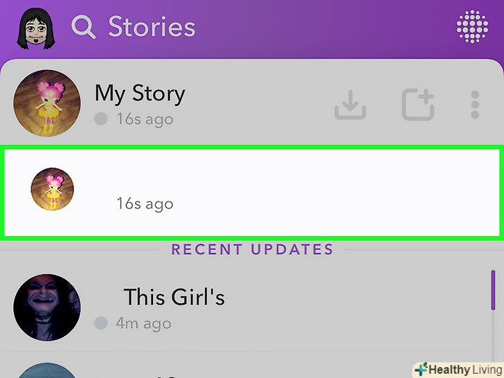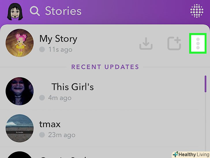 Натисніть на іконку з трьома точками, збудованими вертикально. ця іконка розташована вгорі екрану, праворуч від розділу "Story / історії". Натисніть на неї, щоб відобразити різні повідомлення, з яких складається історія.
