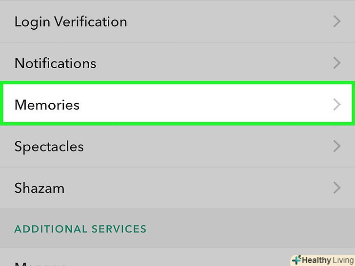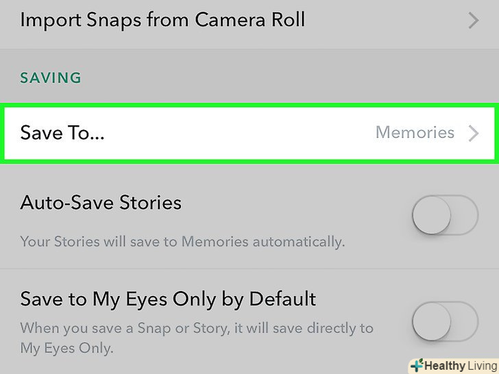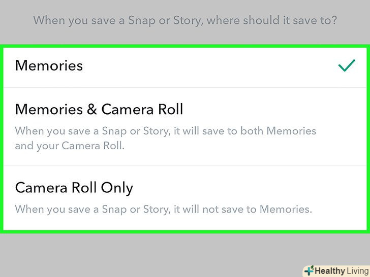 Виберіть місце збереження фото і відео.відтепер Snapchat зберігатиме фотографії та відеоролики у вказаному місці.- Спогади-це фотогалерея Snapchat. Щоб відкрити спогади, проведіть вгору по екрану з включеною камерою.