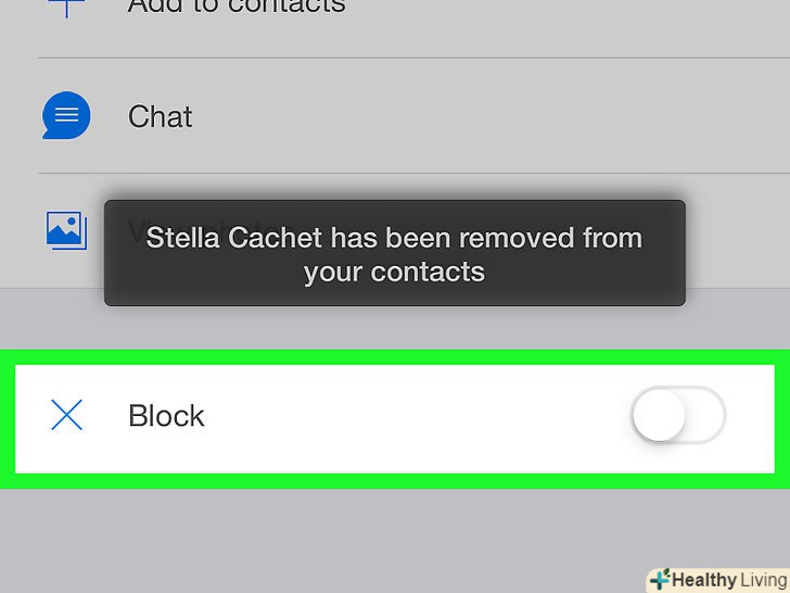 ТоркнітьсяРозблокувати, коли з'явиться запит. користувач буде розблоковано.- Щоб додати людину в свої контакти, відкрийте вкладку "чати«, натисніть на листування з цією людиною, торкніться його імені, а потім натисніть» Додати в контакти" (або аналогічну опцію).