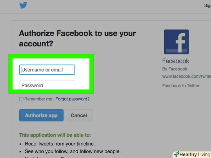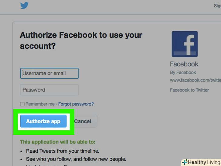 НатиснітьАвторизувати додаток . тепер ваші загальнодоступні публікації та оновлення статусу в Facebook будуть доступні в пов'язаному обліковому записі Twitter. Повідомлення, які не є загальнодоступними, не будуть передаватися у ваш канал Twitter.- Натисніть «Змінити налаштування» під ім'ям користувача або сторінки, щоб обмежити вміст Facebook, яким ви ділитеся в Twitter. Натисніть "Зберегти зміни", щоб оновити налаштування.