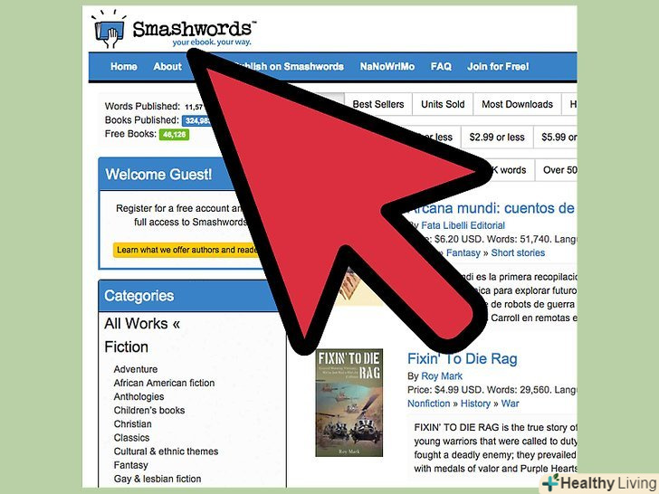 Ви можете знайти книгу на сайті автора, а також на різних форумах.часто книги продаються в колекціях, розбитих на категорії за темами або авторам. Перш, ніж завантажувати файли з невідомого сайту, прочитайте відгуки або перевірте файл антивірусом.[4][5]- Сайт Smashwords дозволяє завантажувати книги незалежних і самовідданих авторів. В основному тут книги в жанрі фантастики.