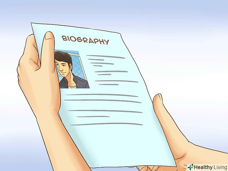 Напишіть коротку автобіографію.вам потрібно буде скласти текст, який дозволить вам продати себе. Підготуйте коротку біографію, з якої буде зрозуміло, чому саме ви здатні добре розповісти цю історію. Включіть в біографію документи, що підтверджують вашу кваліфікацію. Біографія повинна зайняти від половини до однієї сторінки.[5]- Включіть в біографію тільки найважливішу інформацію. Агенту не потрібно знати, що ви виросли в маленькому місті і зараз живете з дружиною і двома собаками. Вкажіть важливу інформацію про свій досвід та освіту в сфері письменницької праці. Якщо у вас вже є публікації або видані книги, вкажіть і це. Якщо ви отримували будь-які нагороди або ваші заслуги як письменника були відзначені яким-небудь іншим чином, про це також варто написати.