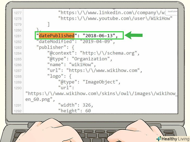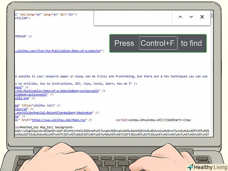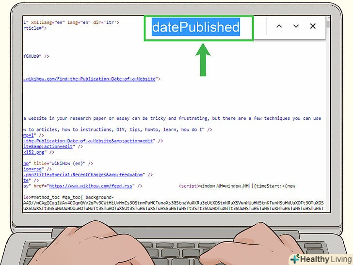 Шукайте дату, зазначену у форматі Рік-місяць-день.вивчіть частину коду, до якої вас привела функція»Знайти". Дата повинна бути вказана відразу після ключового слова. Спочатку буде вказано рік, потім місяць і день.[13]- Використовуйте цю дату, щоб послатися на сайт або визначити, наскільки старою є ця інформація.
