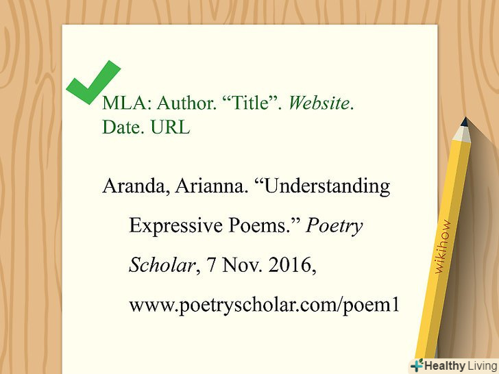 Вкажіть автора, назву Статті, веб-сайт, дату та URL-адресу для цитування у форматі MLA.напишіть ім'я автора. Почніть з прізвища, потім вкажіть ім'я і розділіть їх комою. Поставте крапку, потім напишіть назву статті з великої літери, укладіть його в лапки і поставте крапку. Додайте назву сайту курсивом, потім кому і дату у форматі день-місяць-рік. Поставте кому, потім вкажіть URL-адресу і поставте крапку.[14]- Приклад: Гультяєва, Катерина. "Виразне читання. Як навчити дитину виразно читати". Pedsovet, 31 липня 2014, pedsovet.su/publ/166-1-0-5180.