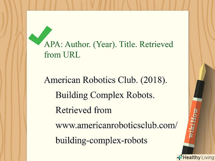 Вкажіть ім'я автора, Рік, назву статті та URL для цитування у форматі APA.напишіть прізвище автора, поставте кому, потім вкажіть його ім'я і поставте крапку. Потім укладіть Рік публікації сайту в дужки і поставте після нього крапку. Напишіть заголовок статті з великої літери, після якого поставте крапку. Нарешті, напишіть " перевірено по» і вкажіть URL сайту, після якого крапка не ставиться.[15]- Приклад: Стиль АПА. (2008). Вікіпедія, вільна енциклопедія. Перевірено поhttp://ru.wikipedia.org/?oldid=11891319