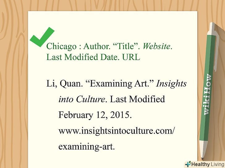 Вкажіть ім'я автора, назву сторінки, назву веб-сайту, дату та URL-адресу для цитування у форматі Chicago Style.розділіть прізвище та ім'я автора Коми. Поставте крапку, потім напишіть заголовок сторінки з великої літери і укладіть його в лапки, після чого поставте ще одну крапку. Додайте назву сайту курсивом. Поставте крапку, потім напишіть " Остання зміна» і вкажіть дату публікації сайту в форматі місяць-день-рік, після якого поставте крапку. Додайте URL-адресу та поставте крапку.[16]- Приклад: Нечухаєва, Наталія. "Як боротися з розкрадачами ваших статей". ШколаЖизни.РП. Остання зміна 18 червня 2019.https://shkolazhizni.ru/computers/articles/98251/.
