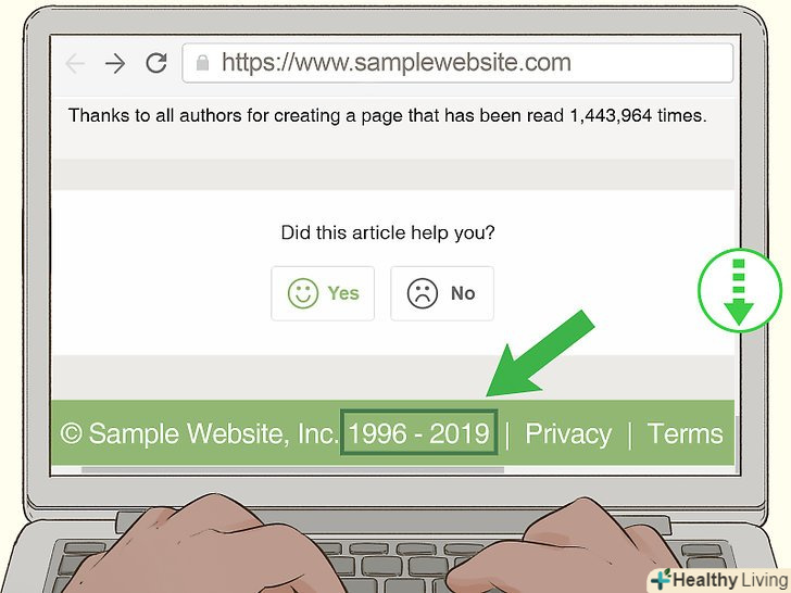 Вивчіть інформацію про авторське право в нижній частині веб-сторінки.перегорніть в самий низ сторінки і погляньте на зазначену там інформацію. Там можуть бути дані про авторські права або примітка до публікації. Вивчіть ці відомості в пошуках оригінальної дати публікації. Однак врахуйте, що ця дата може бути датою останнього оновлення сайту, а не датою публікації.[2]- Дата оновлення сайту дозволяє дізнатися, коли в останній раз що-небудь додавалося або змінювалося на сайті. Іншими словами, цікавить Вас інформація могла бути опублікована раніше. Проте недавня зміна в авторському праві або оновлення означає, що сайт залишається активним і постійно оновлюється, тому інформації можна довіряти.