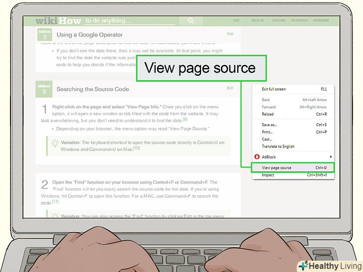 Натисніть на сторінці правою кнопкою миші і виберіть "Інформація про сторінку".після цього в браузері відкриється нове вікно або вкладка, заповнена вихідним кодом сторінки. Не лякайтеся, вам не потрібно розуміти вміст коду, щоб знайти дату.[9]- Залежно від браузера, цей пункт може іменуватися як»Вихідний код сторінки".