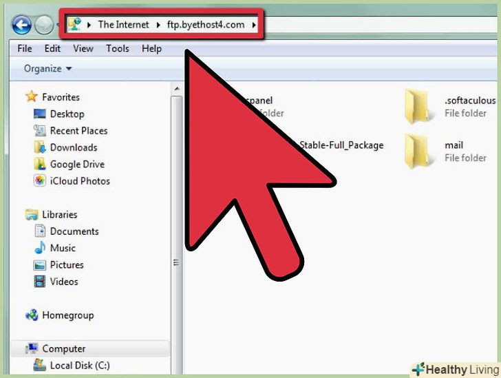 Зайдіть на будь-який тип FTP сервера з комп'ютера Windows.- Відкрийте Windows Explorer на комп'ютері з Windows, потім напишіть IP-адресу комп'ютера з FTP сервером в адресний рядок. IP-адреса повинна бути записана у форматі"ftp://ваш_IP_адрес/."