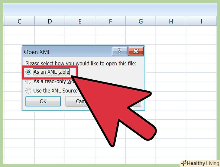 Поставте прапорець у опції»як XML-таблицю".це призведе до перетворення XML-файлу в таблицю Excel.- Швидше за все, відкриється вікно з попередженням, що XML-файл не є таблицею. У цьому випадку натисніть "OK", щоб Excel створив таблицю на основі тегів XML-файлу.