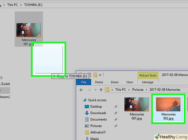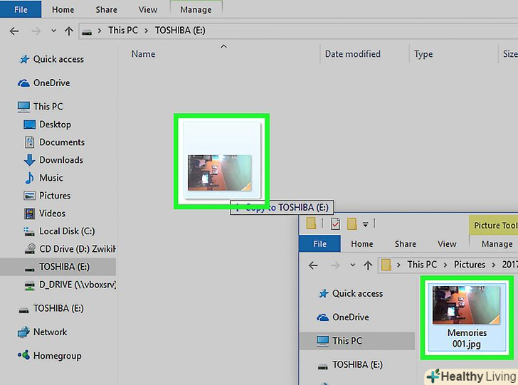Перетягніть фото у вікно флешки.як тільки файл з'явиться у вікні флешки, він скопіювався з комп'ютера на флешку.- За замовчуванням фотографії не переміщаються з комп'ютера на флешку - вони копіюються. Якщо ви хочете перемістити фотографії, видаліть їх на комп'ютері, як тільки вони скопіюються на флешку.