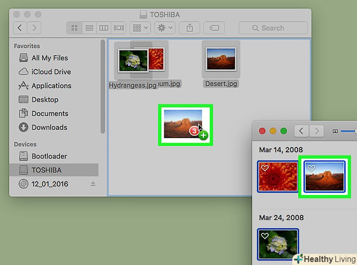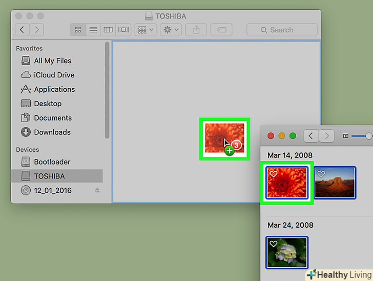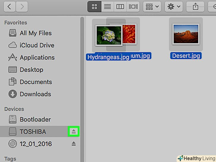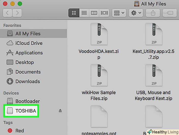 Клацніть по імені флешки.ви знайдете його в нижній частині лівої панелі вікна Finder в розділі "Пристрої". Відкриється вікно з вмістом флешки; в це вікно можна перетягнути фотографії.[1]- Якщо флешка відкрилася, коли ви підключили її до комп'ютера, пропустіть цей крок.