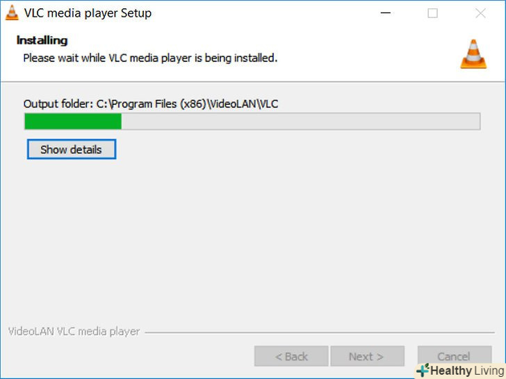 Клацніть поВстановити.ви знайдете цю кнопку внизу вікна. Почнеться установка медіаплеєра VLC.- За ходом установки можна стежити по зеленій смузі У спливаючому вікні.