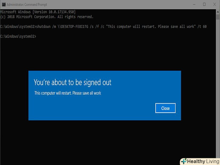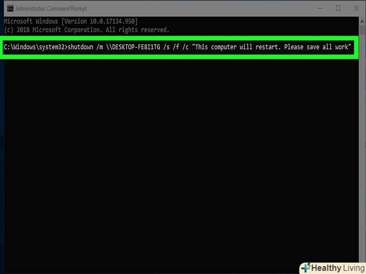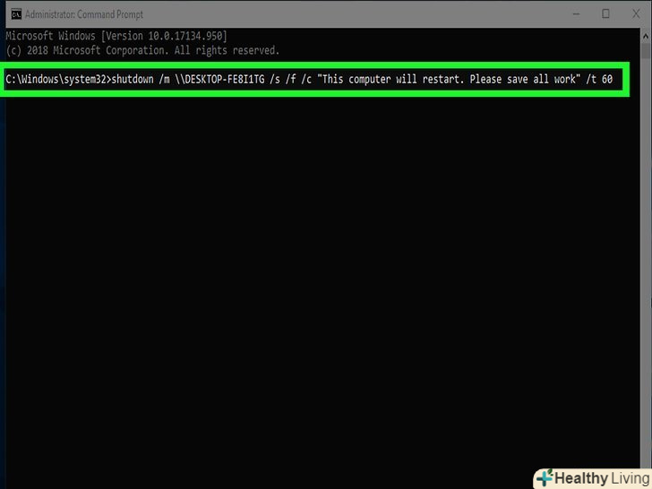 - До цього моменту команда повинна виглядати приблизно так:shutdown \\workspace1 /r /f. Натисніть ↵ Enter, щоб негайно перезавантажити комп'ютер. Перейдіть до наступного кроку, щоб додати таймер з приміткою.