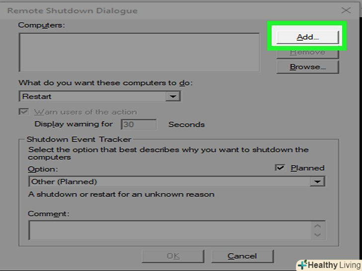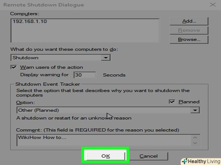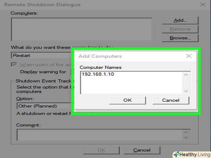 Введіть IP-адресу цільового комп'ютера (комп'ютерів) і натиснітьOk.цільовий комп'ютер-це комп'ютер, який ви хочете вимкнути або перезавантажити. Введіть IP-адресу цього комп'ютера у вікні "Додавання комп'ютерів «і натисніть»ОК".- Якщо ви не знаєте приватну IP-адресу цільового комп'ютера,знайдіть його на ньому.