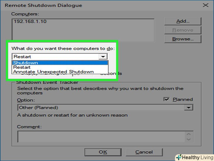 Виберіть, що повинен зробити комп'ютер:Вимкнутися або перезавантажитися. Використовуйте випадаюче меню "виберіть бажану дію для комп'ютерів«, щоб вибрати» завершення роботи «або»перезавантаження".