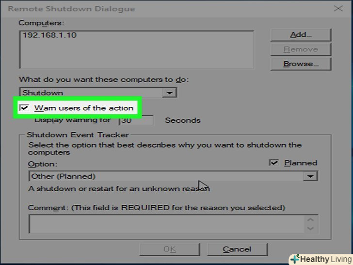Установіть прапорецьпоруч з параметром «попередити користувачів про цю дію» (необов'язково).це дозволить вам встановити таймер на вимикання комп'ютера (ів).