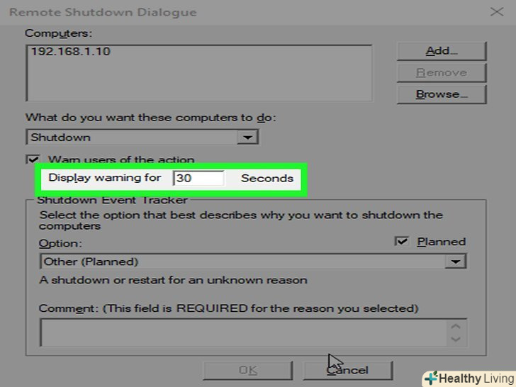 Вкажіть кількість секунд до вимкнення комп'ютера (ів) (необов'язково).введіть число в поле всередині рядка "відображати попередження: [] секунд", щоб встановити таймер на вимикання комп'ютера.