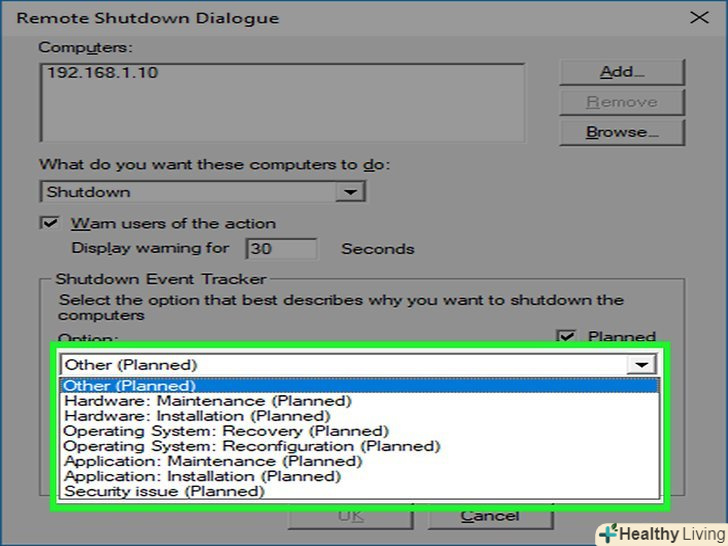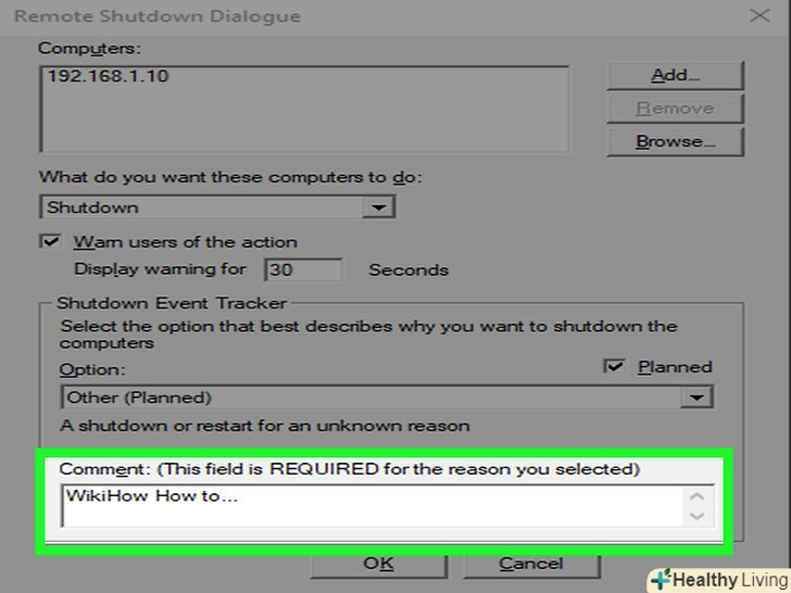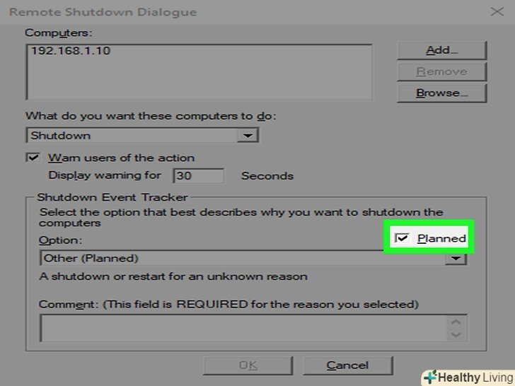 Установіть прапорецьпоруч з параметром «запланована зупинка» (необов'язково).це дозволить вам вказати причину для віддаленого вимкнення або перезавантаження.