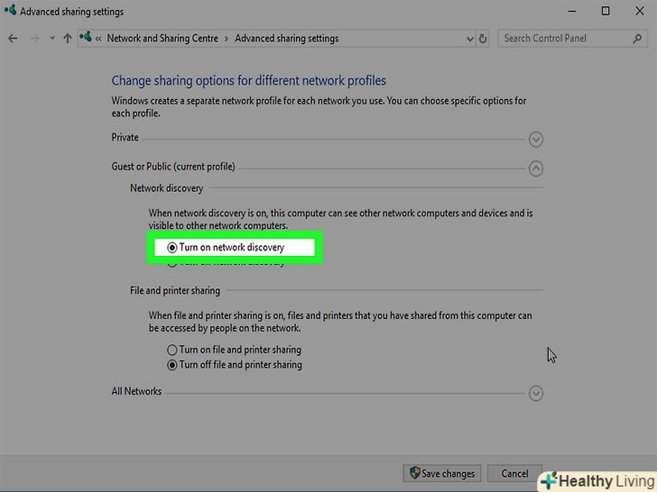 Натисніть на круглу кнопку поруч з написомВключити мережеве виявлення, щоб комп'ютер міг бачити інші комп'ютери.