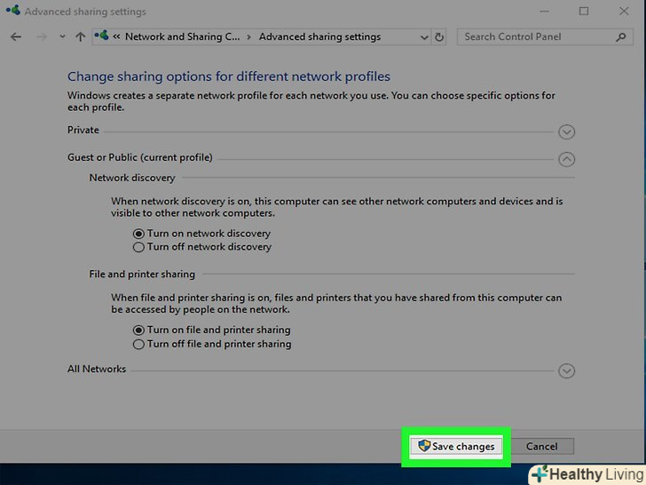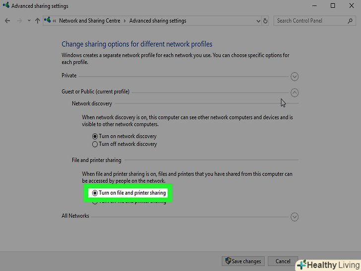 Натисніть на круглу кнопку поруч з написомВключити спільний доступ до файлів і принтерів, щоб дозволити спільне використання файлів і принтерів.