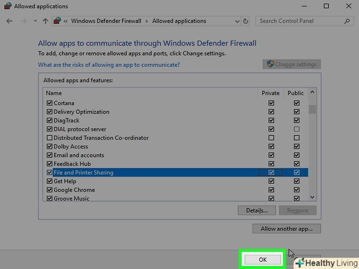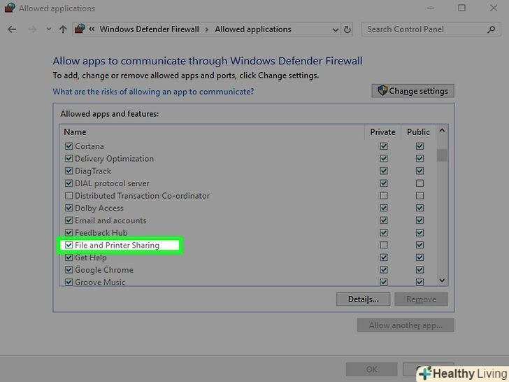 Установіть прапорецьпоруч з пунктом «загальний доступ до файлів і принтерів» в списку дозволених програм і компонентів.