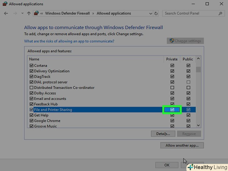Установіть прапорецьв стовпці «приватна», праворуч від пункту «загальний доступ до файлів і принтерів» в списку дозволених програм і компонентів.