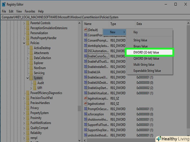 Створіть новий параметр DWORD.виконайте наступні кроки, щоб створити новий параметр DWORD у папці "System".- Клацніть правою кно