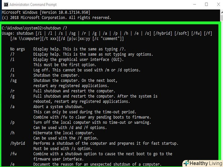 Введітьshutdown в командний рядок. це перший рядок для виключення комп'ютера.- Щоб побачити повний список команд вимикання, введітьshutdown/?.
