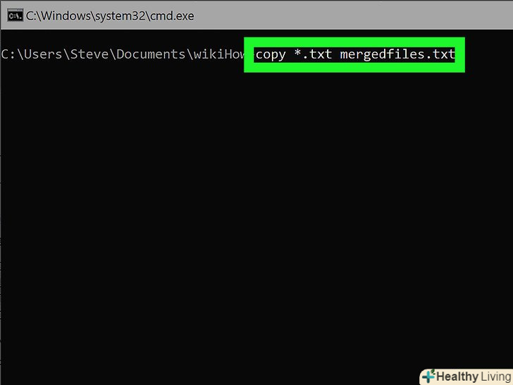 Введітьcopy *.txt newfile.txt у командному рядку. замість «newfile.txt " підставте ім'я файлу, який буде створений (наприклад, mergedfiles.txt).