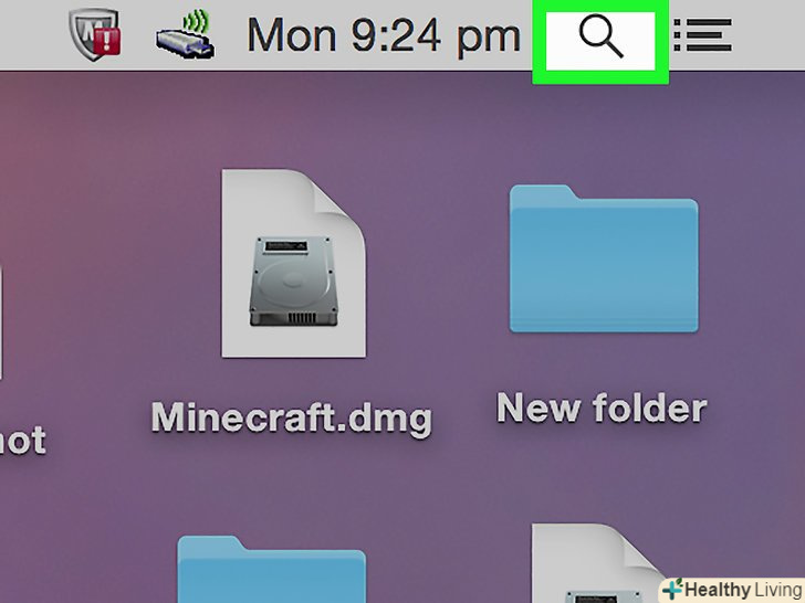 Відкрийте Spotlight.для цього клацніть по значку у вигляді лупи в правому верхньому куті екрану. Відкриється рядок пошуку.