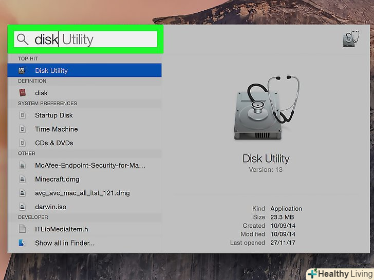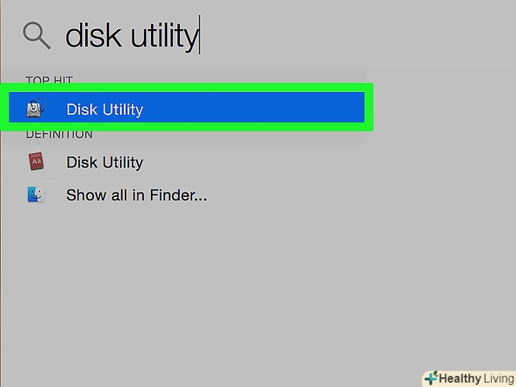 Клацніть поДискова утиліта. це сірий значок у вигляді жорсткого диска зі стетоскопом. Він відобразиться у верхній частині результатів пошуку Spotlight.